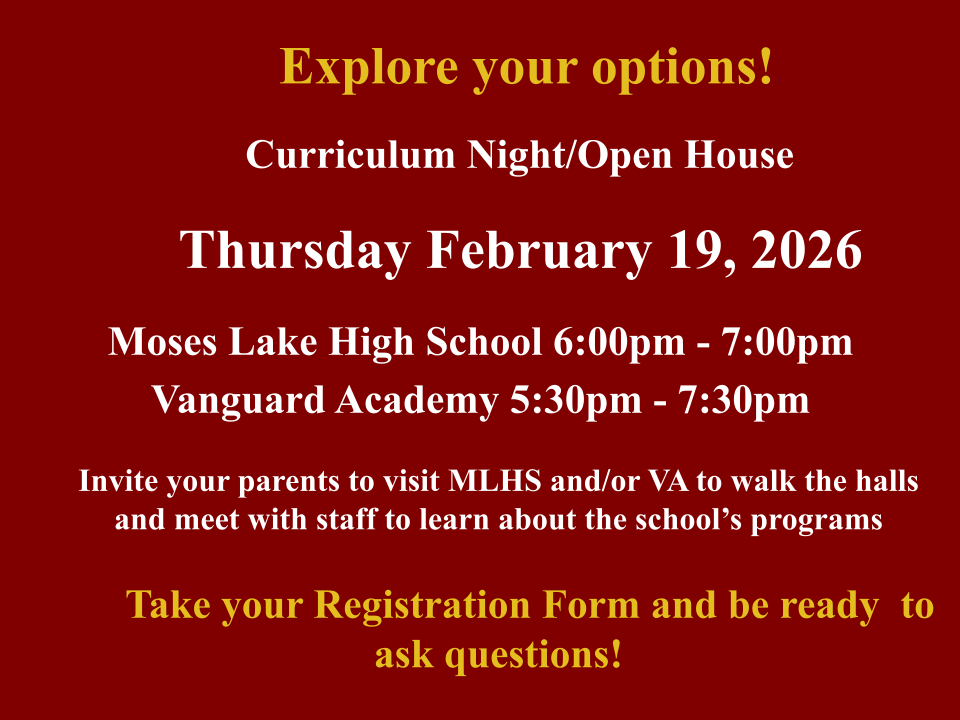 ​8th grade Parents/Guardians,Please read the information below regarding Moses Lake High School and Vanguard Academy ​curriculum and registration for the 2026-2027 school year.